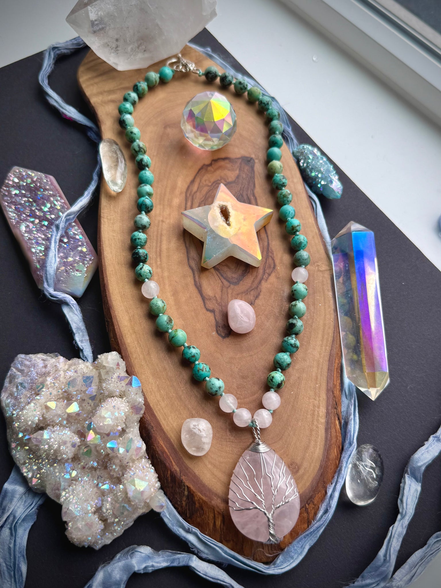 Grounded love, nature’s pulse, and divine renewal. The African Turquoise represents earth wisdom and transformation, while Rose Quartz opens the heart to compassion and tenderness. The Tree of Life focal symbolizes rooted love and growth through every season.