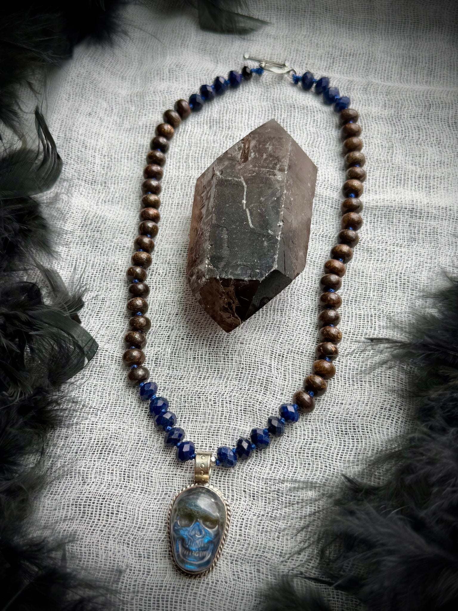 💀 Midnight Ossuary - 16” Choker - 8mm - Lapis + Bronzite Rondelle + Labradorite Skull Focal
