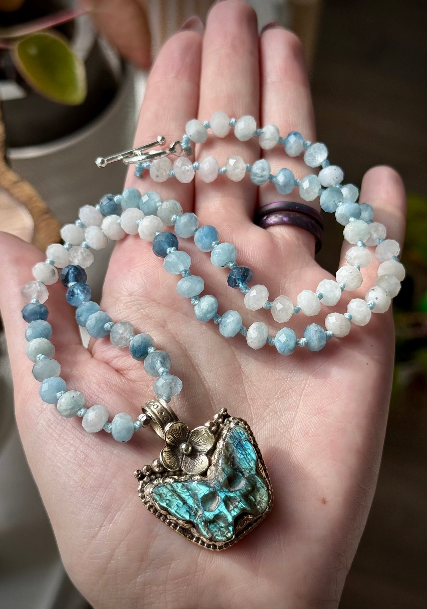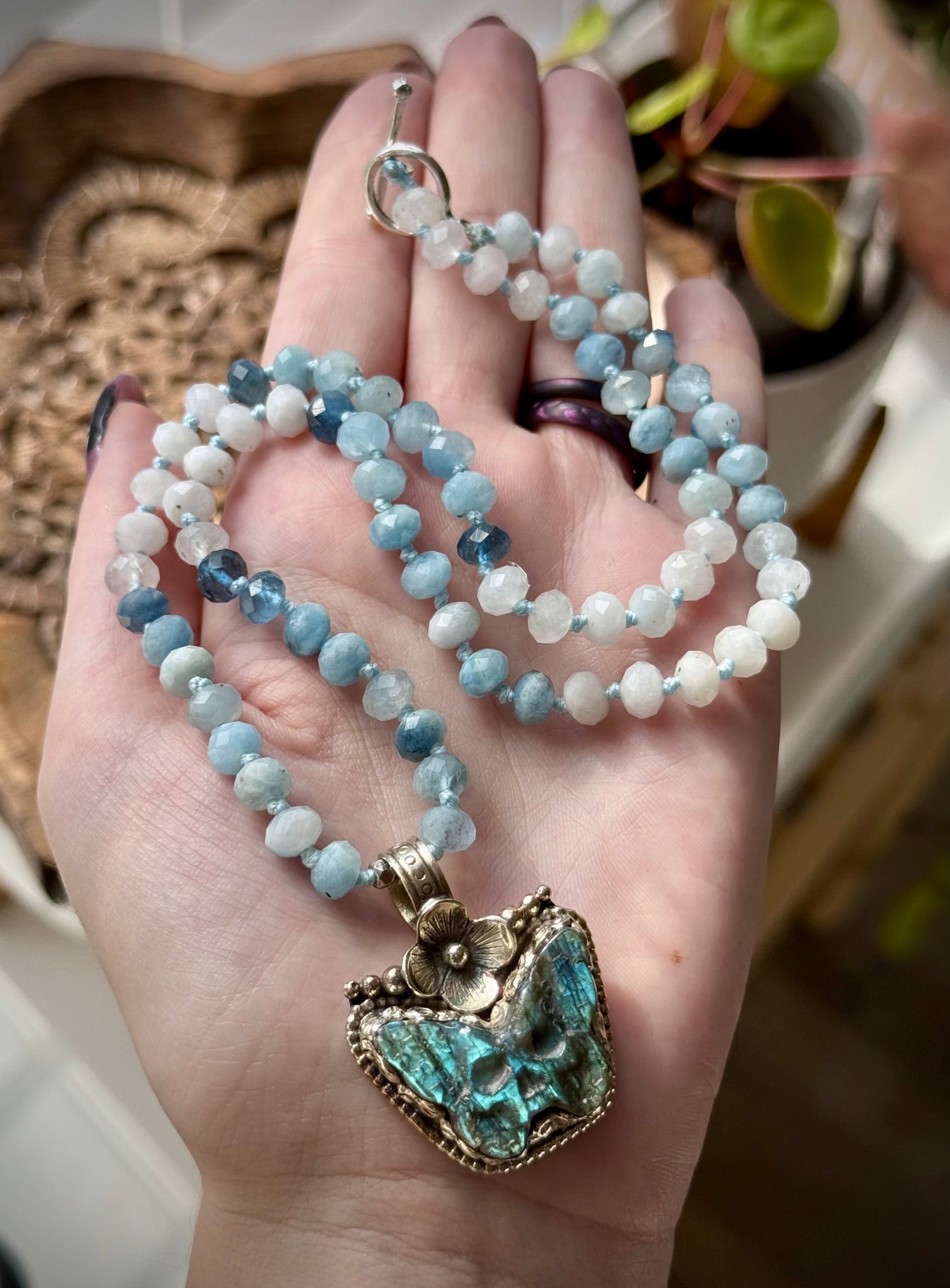 Aqua Mortalis is born from the space between life and decay, where transformation becomes art. The carved skull moth glows with labradorite’s fire, framed in aged brass like a relic from the deep. Each faceted aquamarine bead holds the calm strength of water after the storm, steady and clear.