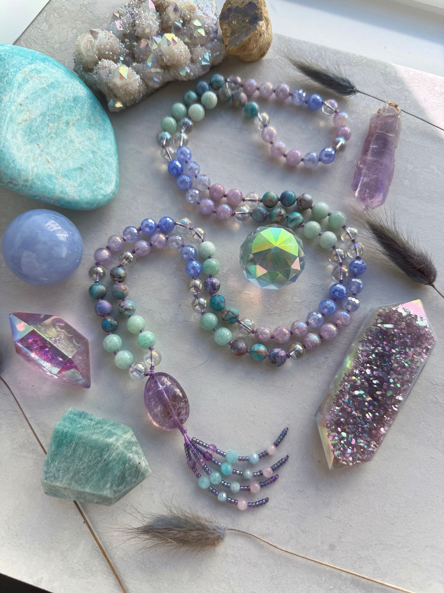 A vision of divine insight wrapped in shimmering pastels, the Iridescent Oracle mala channels both elegance and spiritual clarity. Hand-knotted with 108 beads of aura quartz, calming amazonite, earthy brecciated jasper, aura amethyst, and mystic agate, each stone is chosen for its ability to uplift the spirit while grounding the soul.
