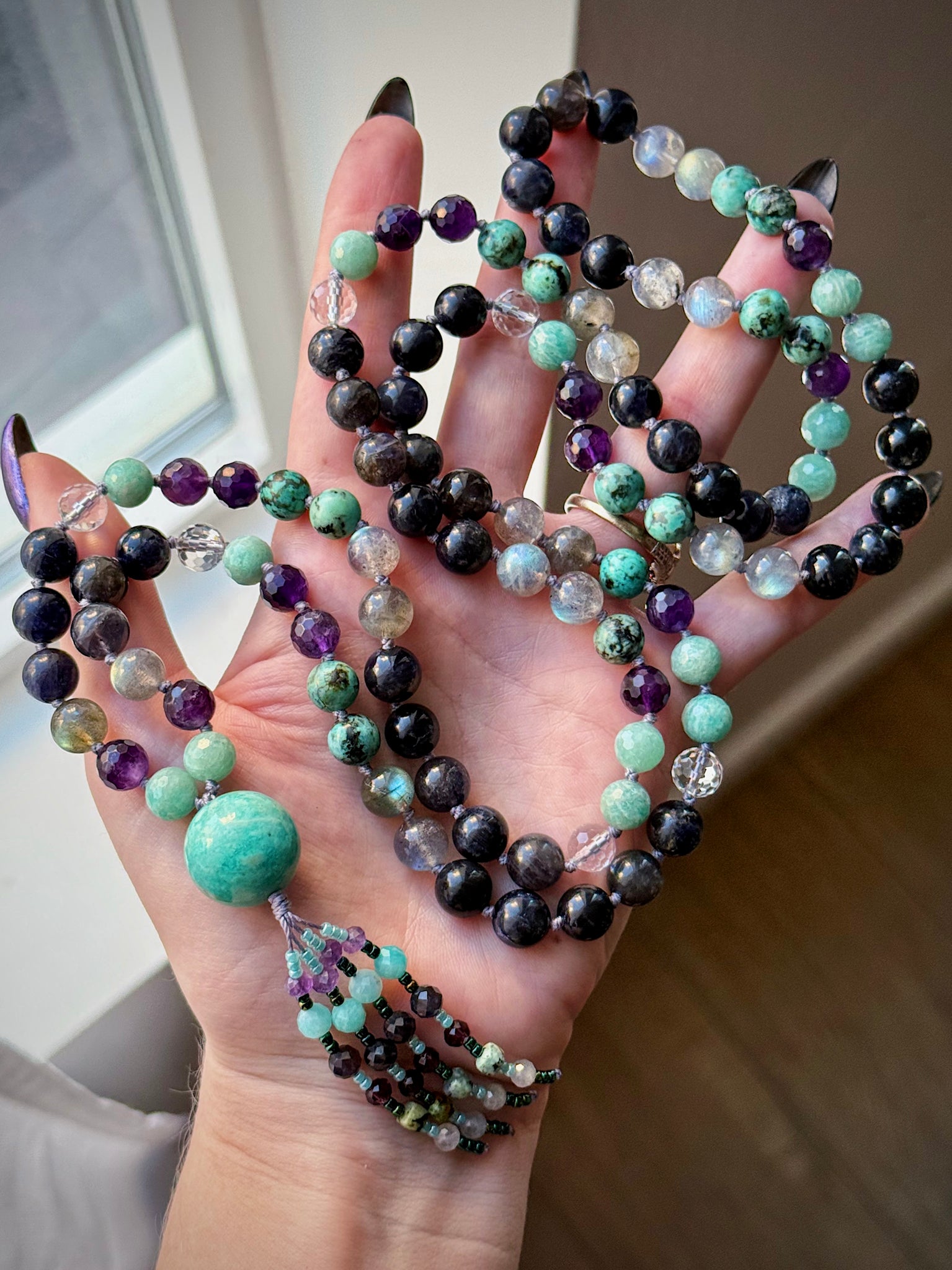 Sacred Discernment - 8mm Amazonite, Amethyst, Labradorite, Iolite, Clear Quartz, African Turquoise - 108 Mala Necklace - Amazonite Focal - Gemstone Beaded Tassel