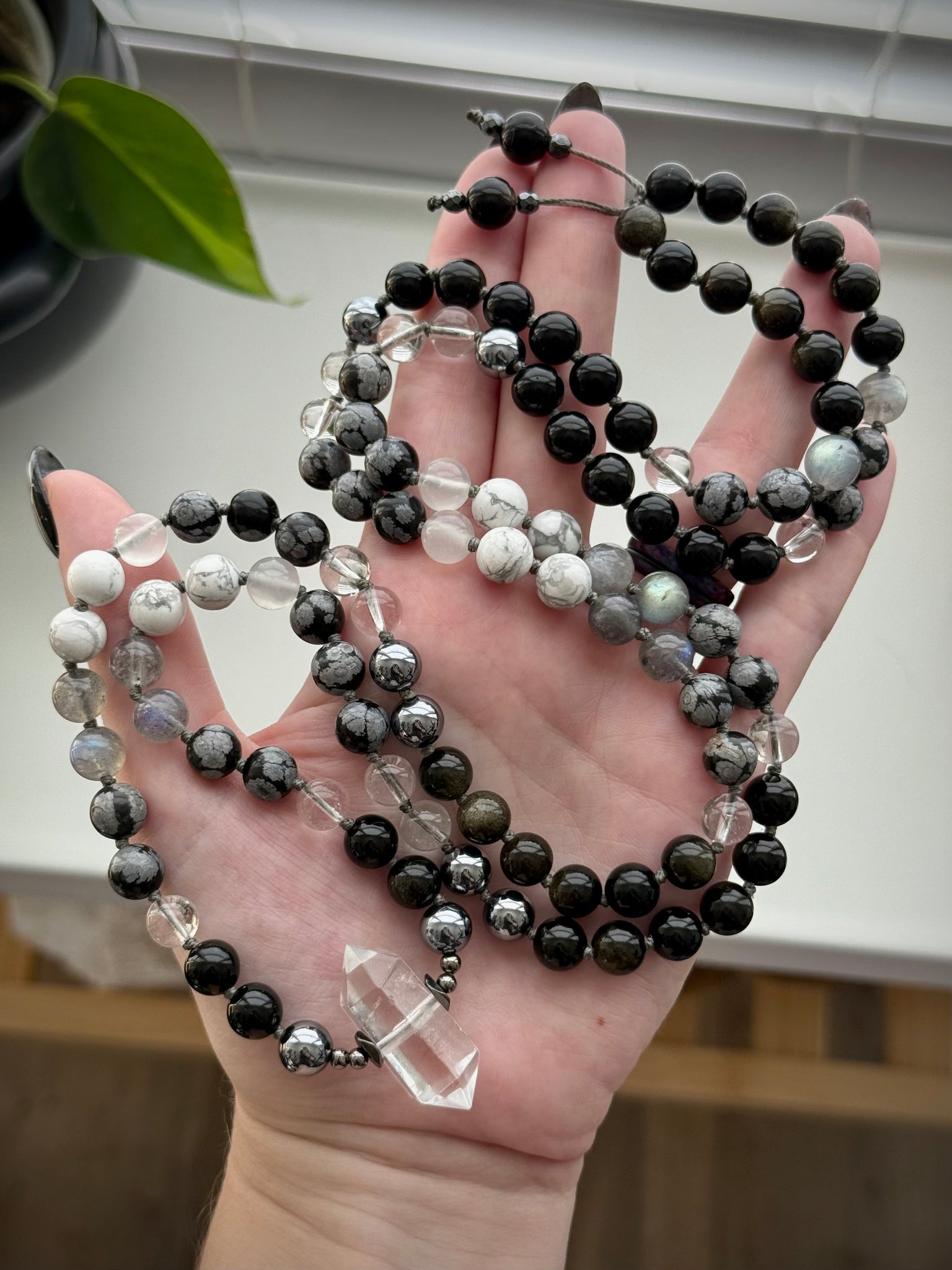 Shadow of Selene - 8mm - Labradorite, Selenite, Quartz, Gold Sheen Obsidian, Terahertz, Howlite, Snowflake Obsidian 108 Mala Necklace - Clear Quartz Focal