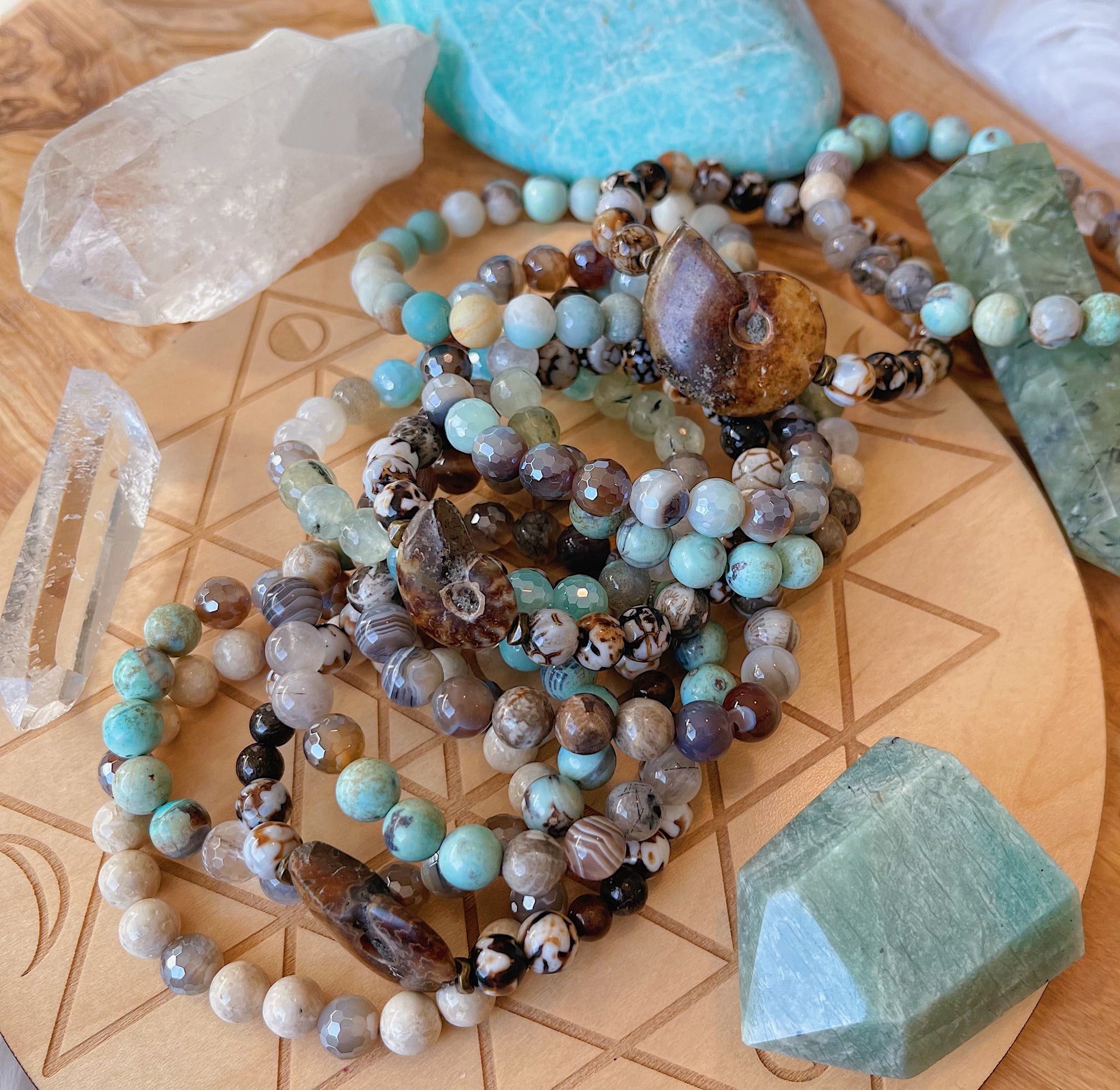This bohemian bracelet features 8mm Robins Egg Agate, Prehnite, Rainbow Moonstone, Riverstone Fossil Coral, Mystic Mocha Agate.