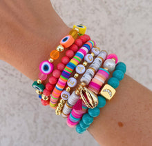 This fun bracelet features 8mm Turquoise Beads accented with an 18K Gold Plated Lucky Symbols Charm Bead. This bead features a Hamsa, Moon, Planet, and Evil Eye.